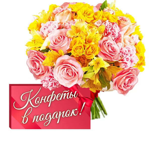 ЛЮКС: роза розовая - 15 шт., роза кустовая желтая - 5 шт., альстромерия желтая - 5 шт., гвоздика одноголовая розовая - 13 шт., фетр розовый, бант розовый, + коробка конфет в подарок.